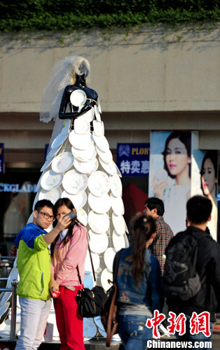 5月11日,“姑娘”穿盘子婚纱裙塑像引路人观看拍照。当日,一尊黑“姑娘”身着盘子婚纱裙塑像现济南街头,引众人侧目观看拍照。中新社发 张勇 摄