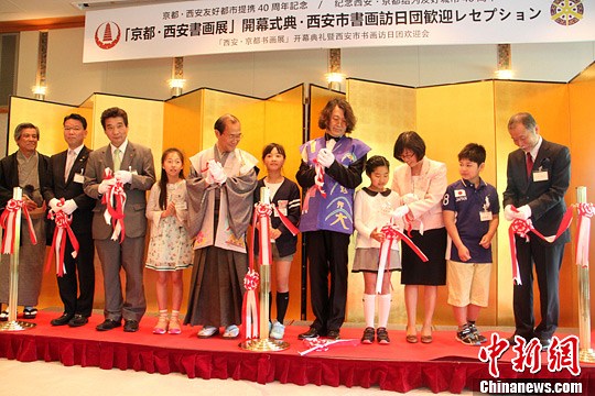 京都市会议长桥村芳和(左三),京都市市长门川大作(左五)等出席了展览开幕式。保圣 摄