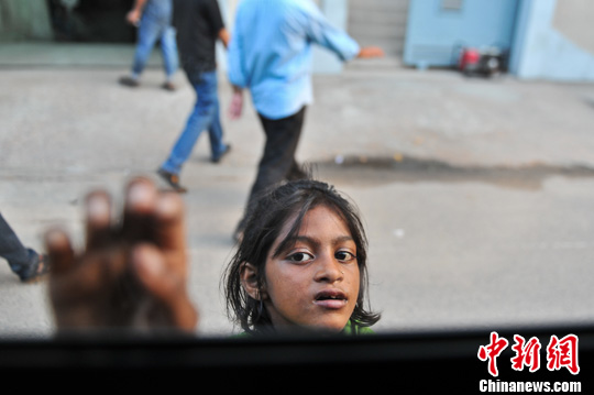 5月12日,孟加拉国达卡街头,一小孩对着镜头挥手。中新社发 任东 摄