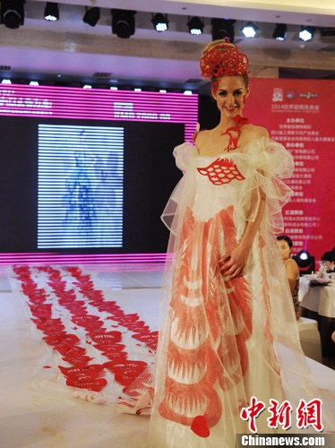 5月13日,超模展示用中国剪纸制作的婚纱服。当日,成都某酒店内举行的一场慈善拍卖会上,一来自成都的民间剪纸艺人用手工制作了一套剪纸婚纱服,并以4000元的价格成功拍出,所拍款项将用作慈善事业。中新社发 刘忠俊 摄