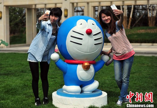 图为市民在与机器猫合影。中新社发 于海洋 摄