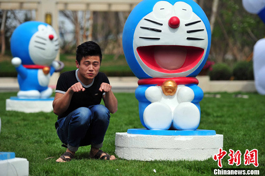 5月14日,市民在与机器猫合影。当日,在沈阳某楼盘售楼处前20只形态可掬机器猫在草地上展出,吸引市民纷纷前来拍照。中新社发 于海洋 摄