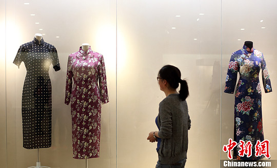 5月14日,近百件港台、大陆名媛衣柜中珍藏的旗袍在南京博物院“芳菲流年·中国百年旗袍展”中集中亮相,其中宋美龄的两件旗袍(左)和连战夫人连方瑀的一件旗袍(右)尤其引来关注。中新社发 泱波 摄