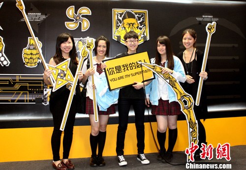 图为观众手持创意作品与参展学生合影。中新社发 陈小愿 摄