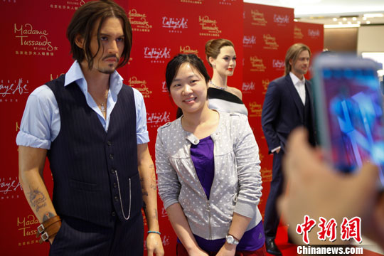 5月16日,好莱坞明星约翰尼·德普、莱昂纳多·迪卡普里奥、安吉丽娜·朱莉、布拉德·皮特的四座蜡像出现在北京某商场,引市民拍照留念。