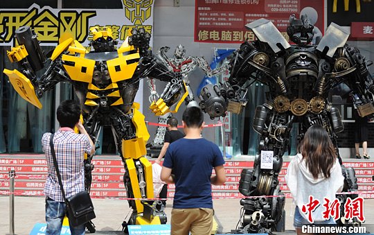 5月19日,西安市雁塔北路,数个威猛的变形金刚矗立在一商场门口,其中一尊“大黄蜂”更是吸引了不少路过行人为其拍照留念。中新社发 张远 摄