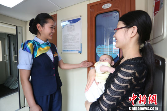 图为乘务员为母乳妈妈介绍列车上专门的哺乳室。 胡志强 摄