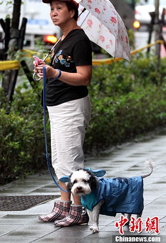台北再迎暴雨 狗狗穿雨衣出行