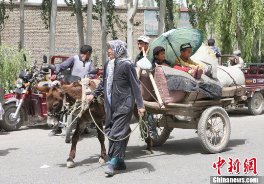5月25日,南疆阿克苏地区乌什县巴扎如往常一样开放。图为少数民族村民赶着驴车、马车“赶巴扎”。中新社发 肖欣 摄