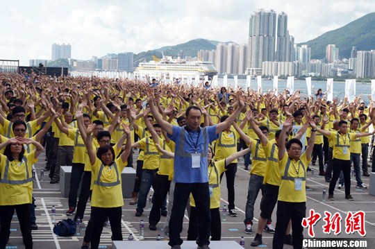 5月26日,参加“香港建造业安全周2014零意外授旗典礼的”的833名工友,一起进行气功“八段锦”早操,以32分50秒的时间,创下最大规模气功课的吉尼斯世界纪录。该项活动鼓励前线工地人员注重工地安全之余,也要重视自身的健康。中新社发 张宇 摄