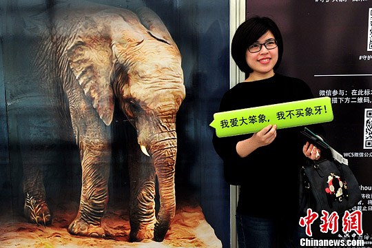 5月26日,一名旅客在广州白云机场参与“抵制非法象牙出入境”活动。广州海关与国际野生生物保护学会联合在该市举办为期一周的“抵制非法象牙出入境”活动。中新社发 陈骥旻 摄