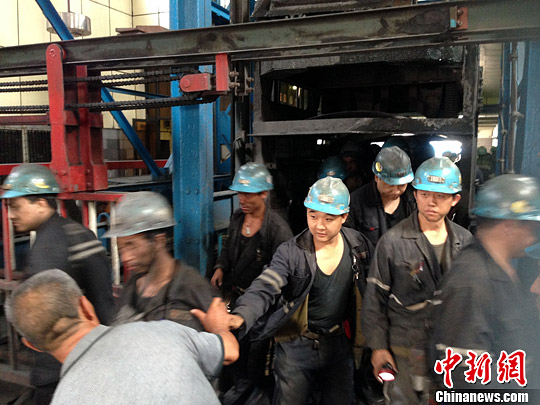 6月3日,河北邢台市显德汪矿透露,截至14时30分,该矿2日透水事故中被困的5人已全部获救,暂无生命危险。图为被困的5名矿工被升降平台拉上地面。中新社发 张鹏翔 摄