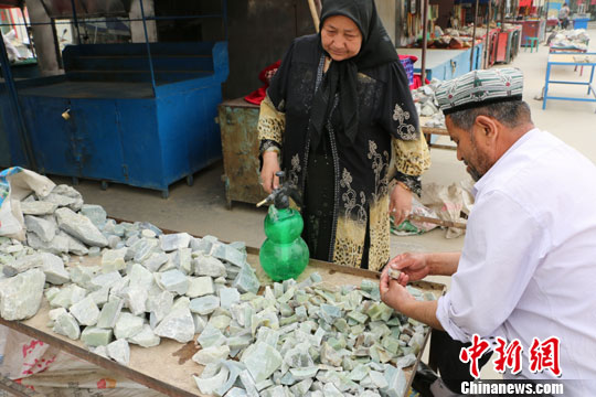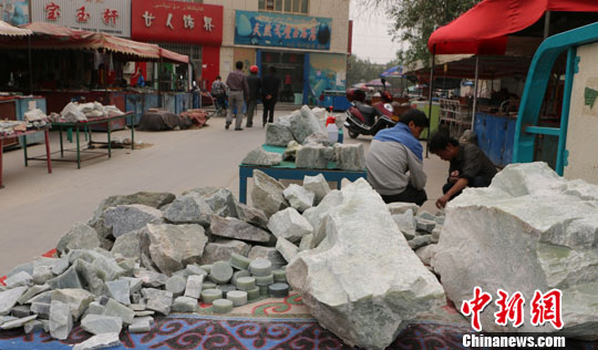 中新网且末6月5日电 (耿丹丹)6月4日,记者在新疆且末县昆玉步行街上的“玉石巴扎”上看到,巴扎上的大块玉石摊随处可见,当地的玉石商人把自家门前整齐的排满了形状各异的大块玉石,按“块”买卖,价钱最低的几十元一块。不少游客驻足于玉石“巴扎”,欣赏挑选玉石。