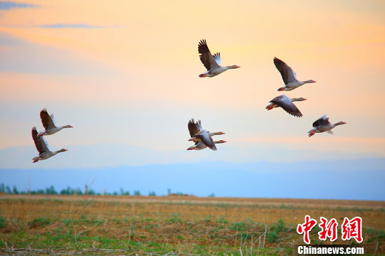 新疆哈巴河县:野雁在晚霞中优美飞行