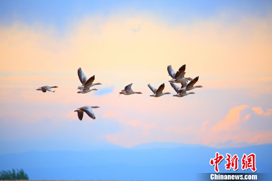 6月初,一群灰雁在新疆哈巴河县城西湿地旁飞翔,它们在晚霞中的飞行姿态十分优美。近年来,随着当地政府对野生动物保护力度的不断加大,当地各族群众也都自觉养成了保护鸟类的良好习惯,灰雁大胆地将自己繁衍生息地选择在了城市边、村落旁的湿地里。它们每天与当地人和谐相处,或飞行、或觅食、或嬉戏,成为当地一道美丽的风景。