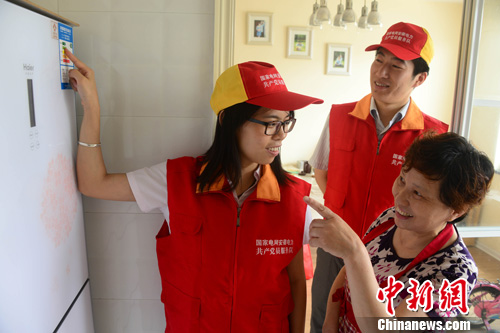 6月12日,国网安徽肥西县供电公司志愿者来到上派镇古埂社区居民家中,向用户讲解节能冰箱标识的含义。