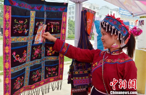 图为仫佬族妇女现场展示仫佬族刺绣信袋。韦如代 摄