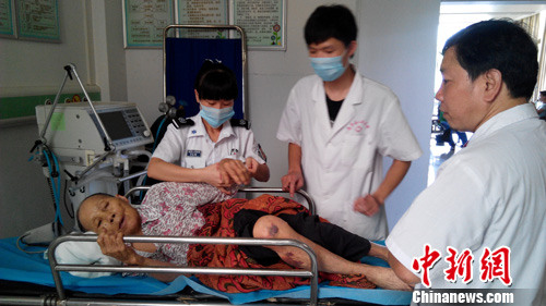 海南“慰安妇”事件受害者、状告日本政府原告之一的苗族阿婆邓玉民19日下午4时10分在家中逝世,享年93岁。图为其今年5月卧病不起后被送到保亭黎族苗族自治县救治。中新社发 陈厚志 摄