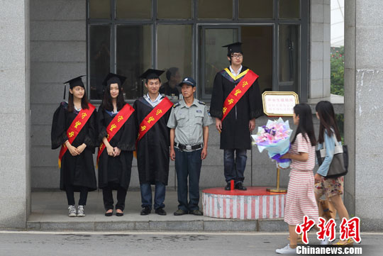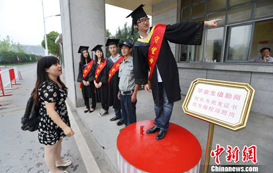 6月20日,从校长手中接过毕业证书、和校长微笑合影,在做完这些毕业典礼的“常规动作”后,中国药科大学药学院的八位2014届毕业生们身穿学士服,身披写有“守望母校”四字的绶带,赶到校门口接替保卫处工作人员,在毕业离校前为母校站一天岗、值一天班,成为校门口一道别致的毕业风景。