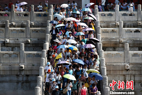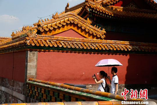 6月20日,游客顶着烈日在北京故宫游玩。当日,北京艳阳高照,故宫里来自世界各地的游客却并不见少。