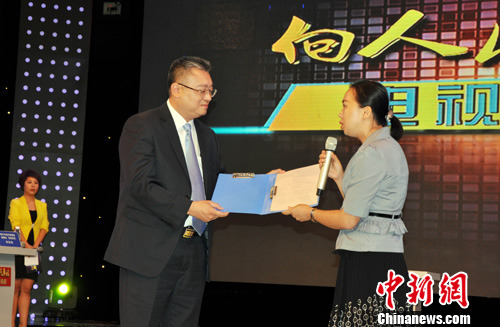 图为南宁市教育局局长教育局潘永钟获赠《深圳市校外午托机构管理办法》信息资料礼物。中新社发 黄艳梅 摄