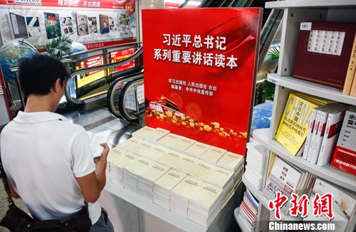 6月24日,一名读者在北京王府井图书大厦翻阅《习近平总书记系列重要讲话读本》。该书由中央宣传部组织编写,由学习出版社、人民出版社联合出版,23日起在新华书店发行。中宣部、中组部发出通知,要求认真组织好《读本》的学习。中新社发 张浩 摄