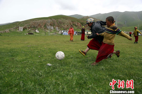 29日,在青海省玉树藏族自治州巴塘草原上,一群来自当地禅古寺的小阿卡进行了一场属于自己的“世界杯”比赛。这群小阿卡最小的6岁,最大的15岁,比赛虽然没有裁判,但每个小阿卡都很注意遵守足球比赛规则。禅古寺是藏传佛教噶举派寺院,因修建和管护文成公主庙而享有声誉,该寺位于玉树州府所在地结古镇南4公里处的禅古村,始建于公元12世纪,海拔3700多米。