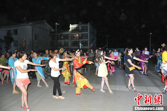 图为来自四面八方的游客与羌族姑娘小伙们共跳莎朗。中新社发 杨勇 摄