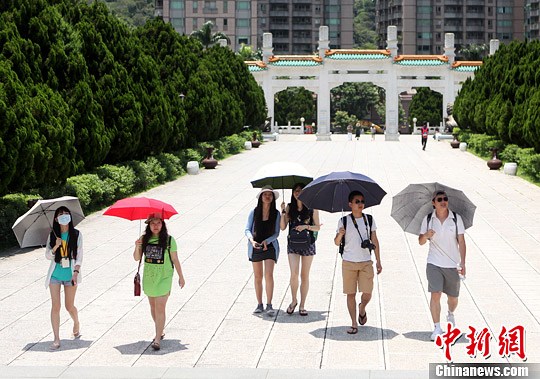7月2日,台北故宫的游客不分男女皆打伞出行。据台湾气象部门观测,当日下午1时13分,台北气温达36.8摄氏度,创台北今年最高气温。中新社发 陈小愿 摄
