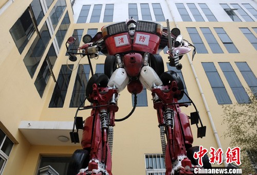这个大块头身穿消防铠甲,身背灭火器,左手拿消防水枪,右手持水炮,胸前写着“消防”二字,被消防官兵们称为消防擎天柱。据秦皇岛消防支队负责人介绍,消防擎天柱全身由180余件废旧消防器材装备和报废的消防车零件组成,身上安装40余盏灯具,历时3个月制作而成。
