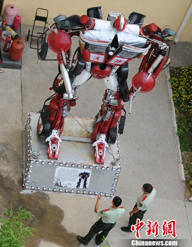 7月4日,河北秦皇岛消防支队官兵正在清洗一个身高4.5米、体重1.5吨的“消防变形金刚”。中新社发 曹庆忠 摄