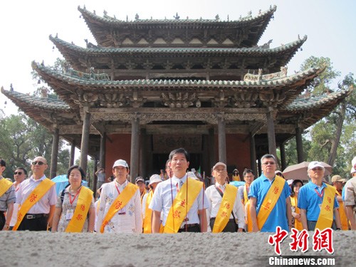 在山西参加“情系三晋--两岸文化联谊行”活动的近150位两岸文化界人士于8日在山西解州关帝庙共同祭拜关公。 图为主祭带领陪祭在关帝庙内站成一排准备祭拜。中新社发 杨喆 摄