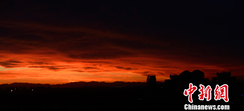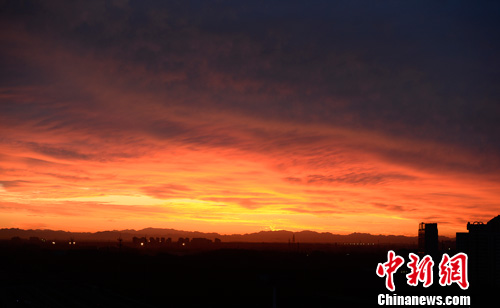 7月9日清晨,北京东方天空出现美丽壮观的朝霞。自8日起,北京告别连日的雾霾,重现蓝天。中新社发 侯宇 摄