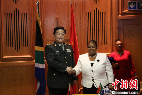 图为常万全与南非国防部长恩夸库拉女士举行会谈,就防务合作等共同关心的问题坦诚深入交换意见。中新社发 宋方灿 摄