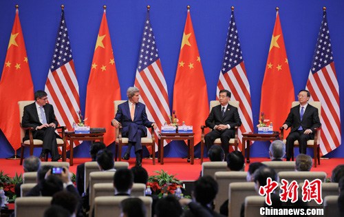 7月9日,第六轮中美战略与经济对话开场会在北京举行,中国国务院副总理汪洋、国务委员杨洁篪,美国国务卿约翰·克里、财政部长雅克布·卢出席。中新社发 侯宇 摄