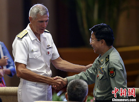 图为美军太平洋总部司令洛克利尔(左)和中国军方人士在开幕会前握手。中新社发 张浩 摄