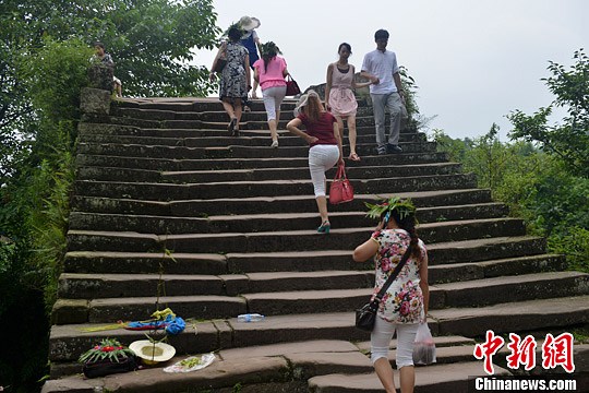 7月15日,一群游客从四川雅安上里镇二仙桥上踏过。二仙桥长15米,宽5米,修建于公元1776年,已经超过200年历史,其桥面和桥拱全部由石头构建。经历了汶川地震、芦山地震后的二仙桥至今完好无损,仍在当地起着非常重要的作用。中新社发 张浪 摄