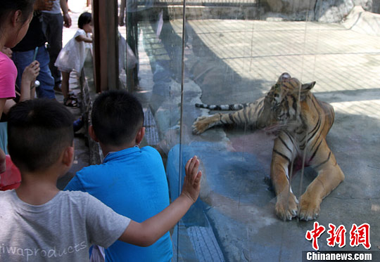 7月29日是世界爱虎日,在南昌动物园华南虎游览区,不少孩子隔着防护玻璃近距离参观华南虎。姜涛 摄