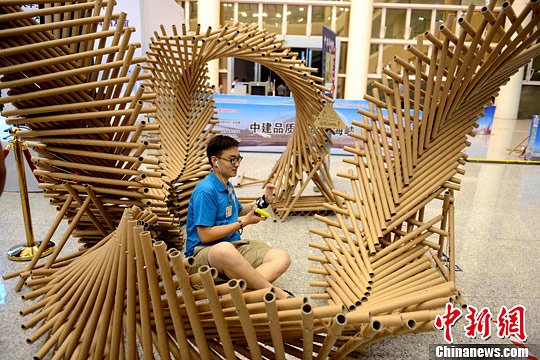 近日,首届“中建海峡杯”海峡两岸大学生建构大赛落下帷幕。比赛作品采用生活中的废旧材料作为原材料并由学生们在3*3的空间里设计出实用且富有创意的作品。比赛中两岸参赛队员进行交换,共同完成作品搭建。中新社发 王东明 摄