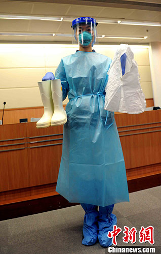 当天,医护人员在会上示范穿着全套防护装备,包括防水帽、面罩、N95口罩、防水保护衣、手套和鞋套。若有确诊个案,更要增加一个头套及强力水靴。