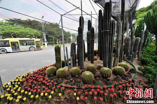 8月17日,萌萌的仙人掌多肉植物首次成为厦门街头绿化景观。日前,厦门白鹭洲路和湖滨西路出现了两处用仙人掌打造的绿化景观小品,仙人掌胖胖的身子顶着红色、黄色的小帽儿,分外别致。据了解,这是厦门市首次尝试把仙人掌多肉植物移到路边打造的绿化景观小品,在全国也属罕见。园林专家说,仙人掌这类植物很耐旱,几乎不用打理,减轻了养护的负担,管理起来很轻松,同时也让路边的风景变得多样。