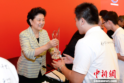 在邓小平诞辰110周年之际,第九届中国青少年科技创新奖颁奖大会8月20日在人民大会堂举行。中共中央政治局委员、国务院副总理刘延东出席颁奖大会并讲话。中新社发 刘震 摄