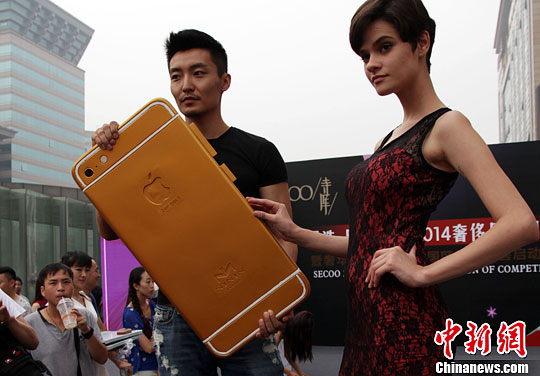 8月30日下午,在电商的一场路演活动中,模特展示了放大五倍的3D打印奢华版Iphone6模型。中新社发 钟欣 摄