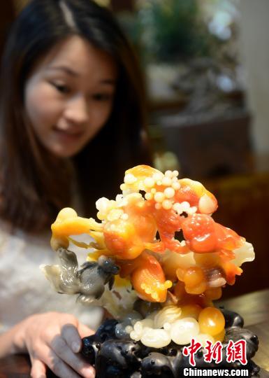 9月2日,由福建省工艺美术大师朱辉经过三年多精心雕琢而成的寿山石精品五彩结晶性芙蓉石作品《金玉满堂》,首次亮相福州华城艺术馆,吸引众多寿山石爱好者的眼球。据介绍该作品长20.5cm、宽13.5cm、高18cm集五种颜色为一身,十分罕见。刘可耕 摄