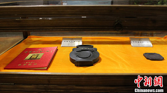 图为搭载神州九号飞船遨游太空,随蛟龙号深潜5200多米的“中华飞天砚”和“中华蛟龙砚”。周毅 摄