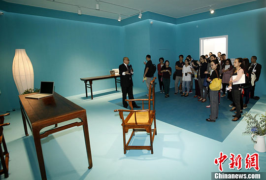 9月17日,纪念王世襄先生诞辰百年,由中国嘉德在北京798艺术区艺术工厂举办《7间房——嘉木堂明式家具现代生活空间暨王世襄先生纪念室》大展启幕,28件明式家具珍品和数件王世襄先生旧藏文玩展现给世人。图为展览现场。中新社发 杨可佳 摄