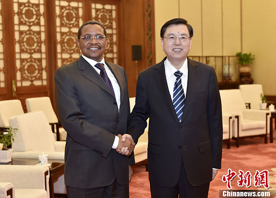 10月24日,中国全国人大常委会委员长张德江在北京人民大会堂会见坦桑尼亚联合共和国总统基奎特。中新社发 刘震 摄