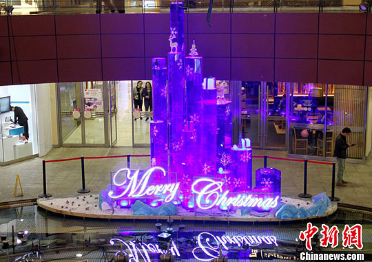 南京许多大型商场、购物中心门口摆放了圣诞主题的大型灯饰模型,有圣诞树,还有巨大的圣诞铃铛,吸引不少游客驻足留影。李珂 摄