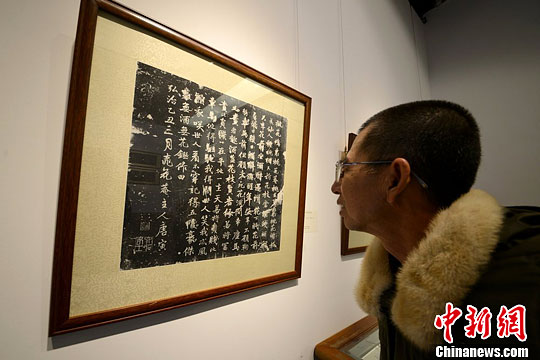 参观者被展出的唐伯虎(唐寅字号)拓片展品所吸引。王思哲 摄