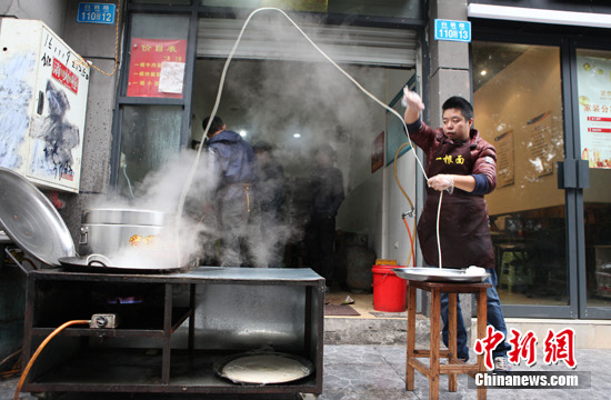 图为师傅将面条向天空抛去,空中划出起伏的弧线,最高离地约两三米,最后面条稳稳落入沸腾的大锅灶内。 中新社发 钟欣 摄